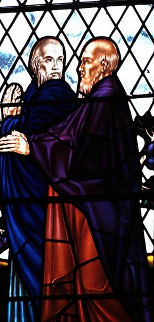 Stained glass window, St James, Stanstead Bury. Photo 1980