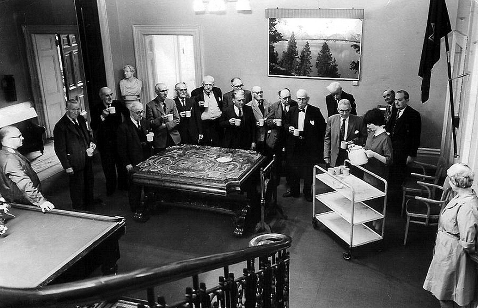 Netherfield House, Salvation Army Eventide Home entrance hall. Marlene Finney serves tea to the establishment. Brigadier Harold Finney, who ran the home, is on the extreme left of the picture. Photo around 1966. Copyright Marlene Harris.