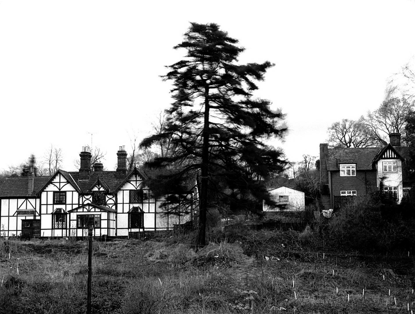 The cottages in Kitten Lane, viewed from the Hunsdon Road. This view is now obscured by the trees and bushes that had just been planted. Photo 1975.