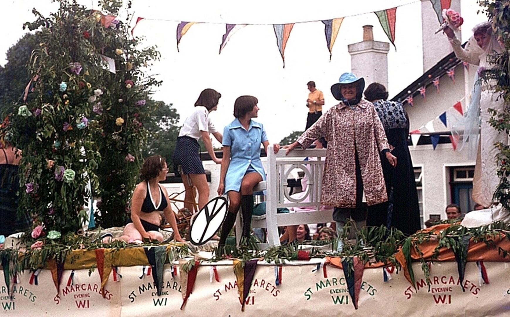 Womens Institute float by Queens Head pub. The lady in the smock dress is Liz Carter who kindly took care of me one night, when I was "slightly innebriated" after a session in the Village Club. Sadly no longer with us. The chap on the pub roof is Ted Chandler. Photo 1970's.